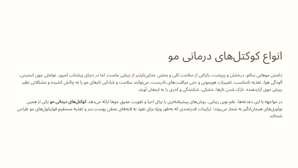 نتیجه‌گیری: برای بهره‌مندی حداکثری از قدرت کوکتل‌های درمانی مو، قدم اول و آخر، مشاوره با یک متخصص مجرب است. تشخیص دقیق و انتخاب آگاهانه، کلید رسیدن به موهایی سالم، زیبا و شاداب است.